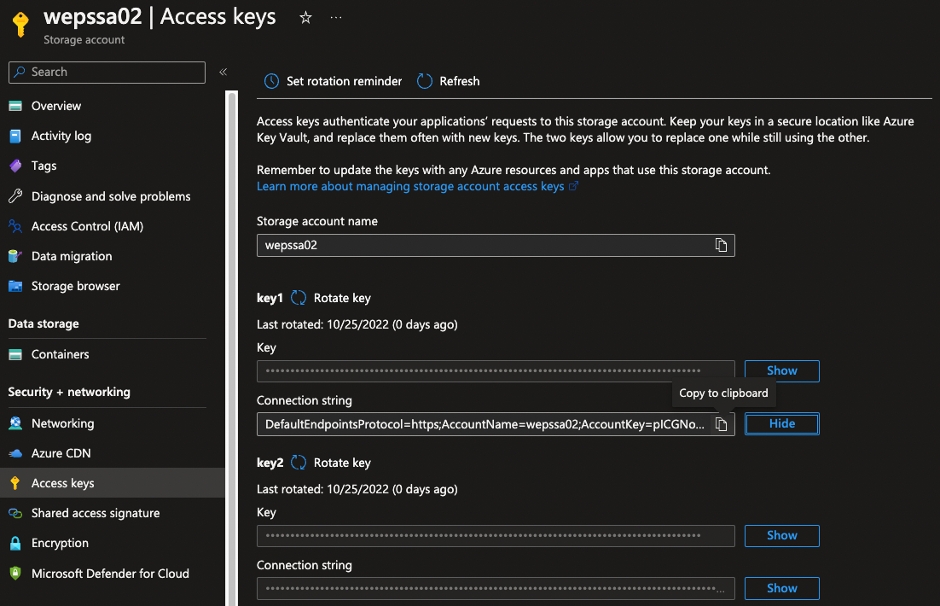 This string can be retrieved from your storage account in Azure. Inside the Azure Portal, navigate to the storage account, click Access Keys, and copy the contents of Connection String as shown below.