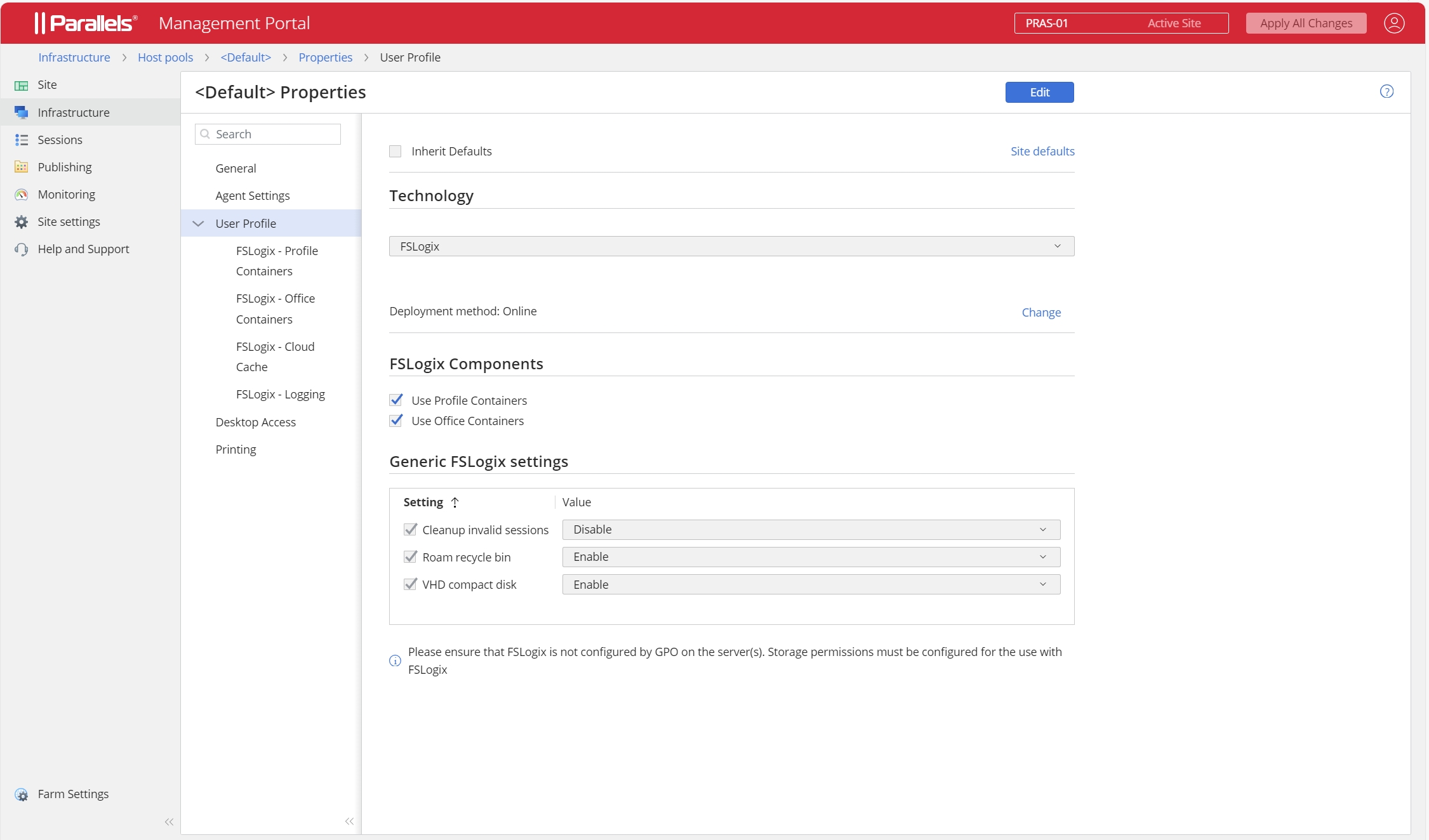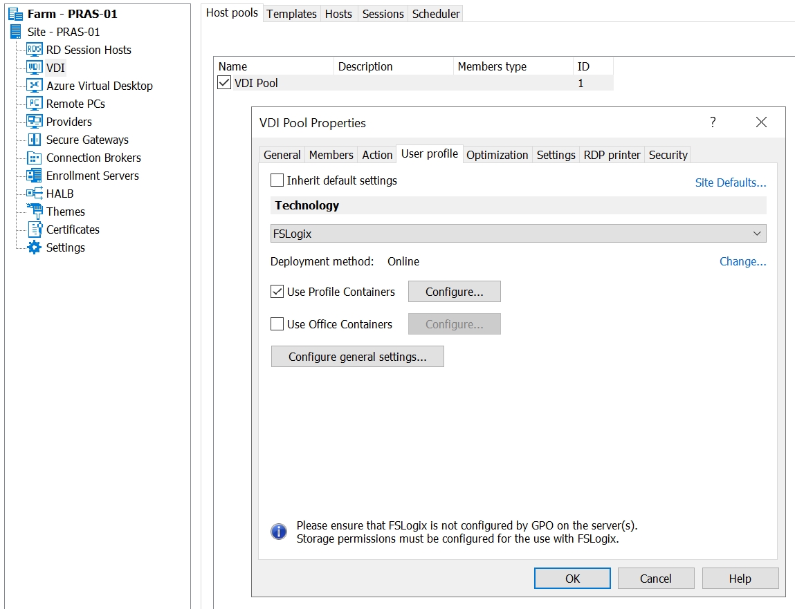 FSLogix configuration can either be enforced on an individual server or on multiple servers at once using host pools Group Defaults. For testing purposes, when configuring RDSH, it is recommended to test FSLogix configuration on a single machine before applying the settings to all machines.