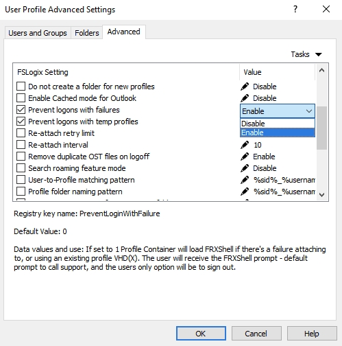 Cleanup Invalid Sessions: In cases where a user's session terminates abruptly, the VHD(X) mounted for the user's profile isn't properly detached and the user's next sign-in may not successfully attach their VHD(X) container. Enable this setting, and FSLogix will attempts to clean up these invalid sessions and allow a successful sign-in.