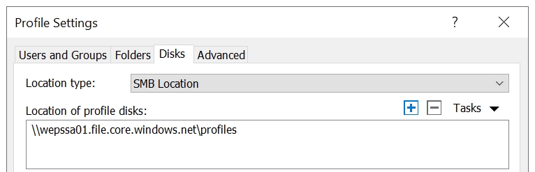Location of profile disks: Specify one or more locations per FSLogix requirements (https://docs.microsoft.com/en-us/fslogix/profile-container-configuration-reference). SMB Location stands for VHDLocations, Cloud Cache – CCDLocations.