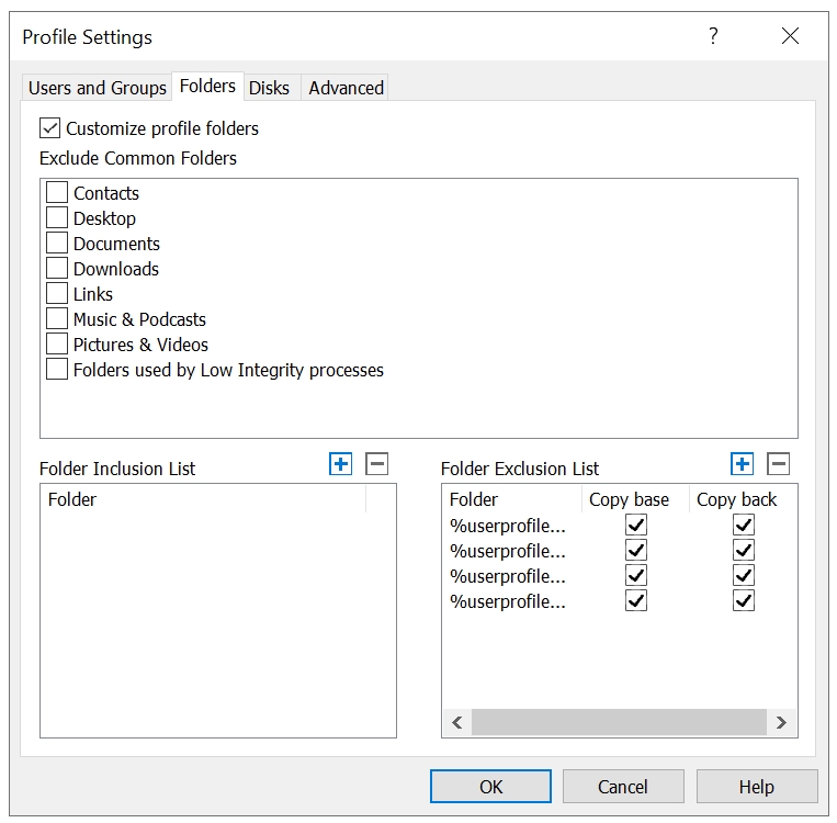 Users and Groups: This tab allows specifying include and exclude user and group lists. By default, “Everyone” is added to the User inclusion list. If you want some user profiles to remain local, you can add those users to the exclude list. Users and groups can exist in both lists, but the exclude list takes priority in this case.