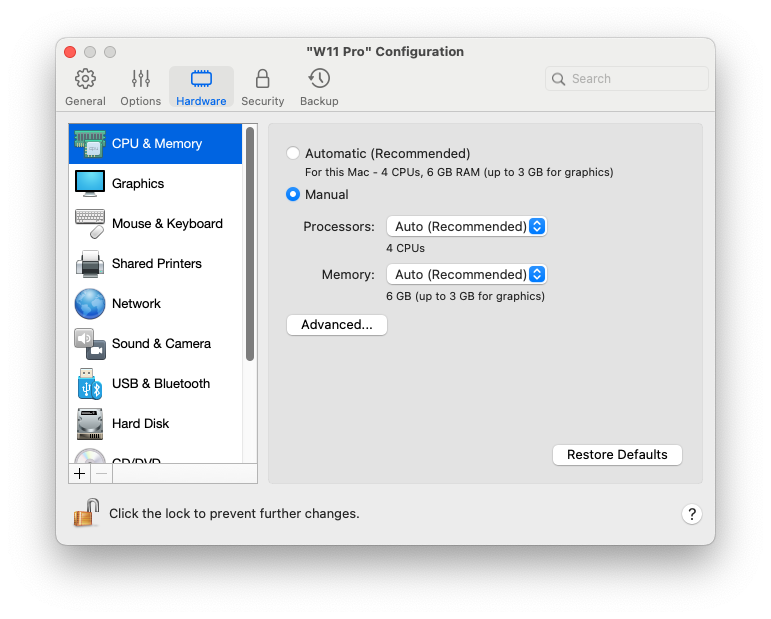Pour ouvrir ces paramètres, sélectionnez **Actions** > **Configurer** > **Matériel**, puis **CPU et mémoire**.