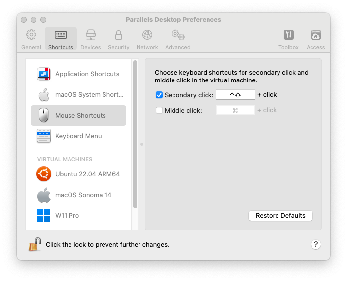 Plusieurs tâches dans Windows telles que l'apparition des menus de raccourcis sont accomplies par un clic droit. Par défaut, Parallels Desktop est configuré pour reproduire un clic-droit lorsque vous appuyez sur Maj+Ctrl et cliquez sur la souris. Vous pouvez changer le raccourci clavier qui déclenche un clic droit. Suivez l'une de ces procédures :