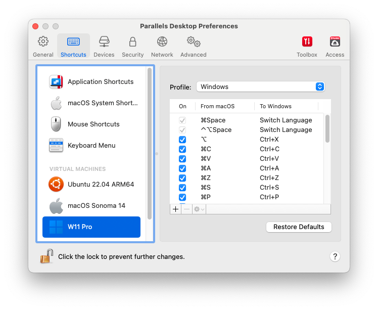 Par défaut, Parallels Desktop mappe les raccourcis clavier communs de macOS en raccourcis clavier Windows équivalents. Prenons un exemple : si vous êtes habitué à appuyer sur Commande-C pour copier le texte dans macOS, vous n'avez pas besoin d'utiliser l'équivalent Windows, à savoir Ctrl-C.