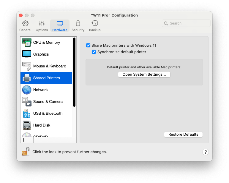 Nel riquadro **Stampanti condivise**, puoi condividere la stampante Mac con la macchina virtuale, sincronizzare la stampante predefinita e altro ancora.
