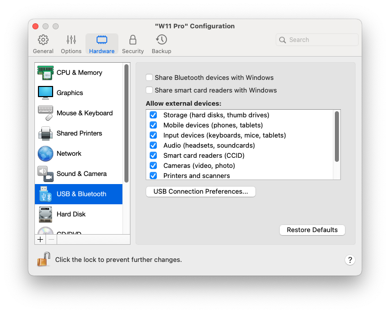 Per aprire queste impostazioni, scegli **Azioni** > **Configura** > **Hardware**, quindi fai clic su **USB e Bluetooth**.