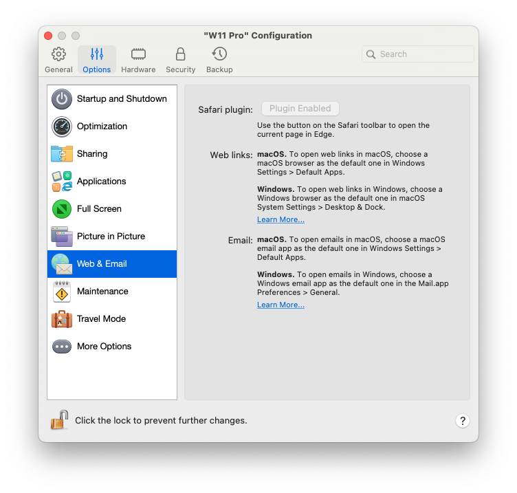 Nel riquadro **Web ed Email**, puoi attivare il plug-in per Safari per aprire le pagine Web in Microsoft Edge. Puoi anche consultare come [configurare i collegamenti e le e-mail che apri in Windows affinché si aprano sempre in un browser Web macOS o app di posta e viceversa](https://docs.parallels.com/landing/pdfm-ug/v19-it-it/parallels-desktop-for-mac-19-users-guide/usa-windows-sul-mac/definisci-come-windows-funziona-con-macos/condividi-elementi-tra-macos-e-windows/imposta-i-collegamenti-internet-o-le-e-mail-affinche-si-aprano-sempre-in-macos-o-windows).