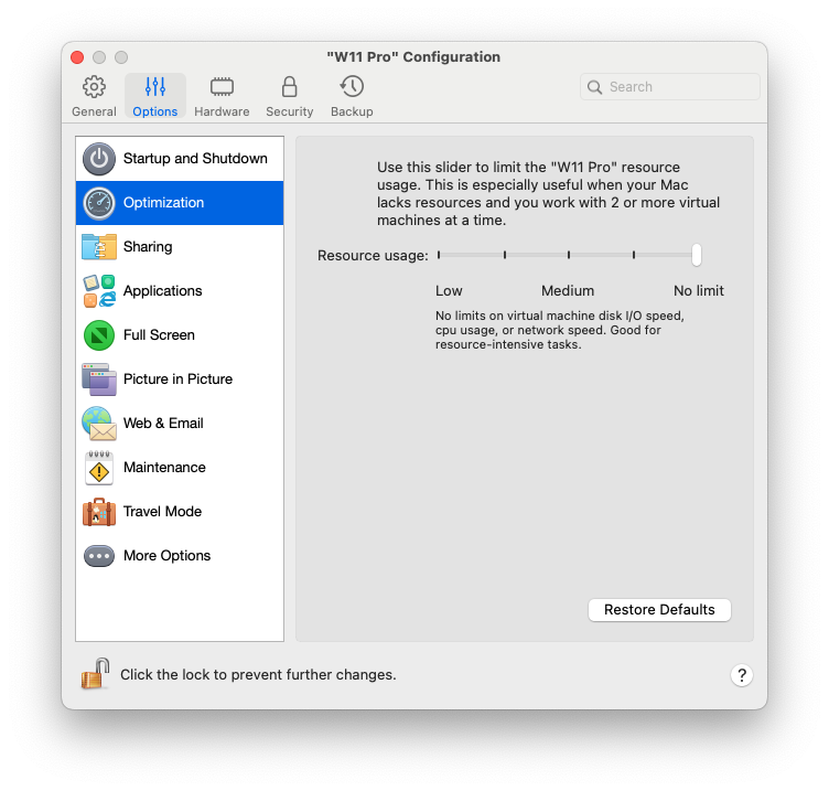 Se il Mac non dispone di risorse per l'esecuzione di due o più macchine virtuali alla volta, puoi limitare l'utilizzo delle risorse in modo che la macchina virtuale che svolge le operazioni più importanti abbia più risorse. Trascina il dispositivo di scorrimento tra i punti **Basso**, **Medio** e **Nessun limite**. Se modifichi questa impostazione e poi non sei soddisfatto delle prestazioni di Windows, prova un'impostazione diversa.