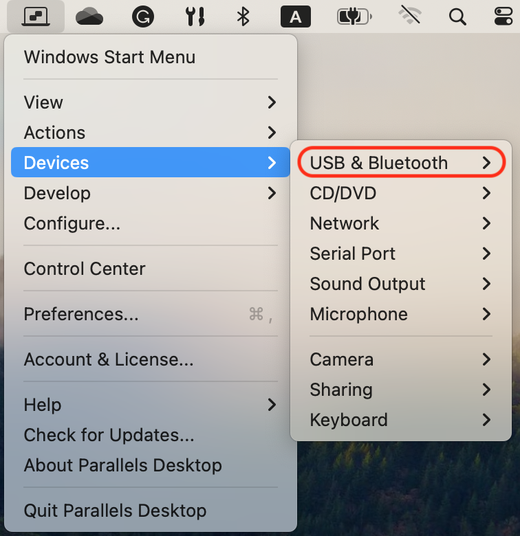 * Windows が Coherence モードで実行されている場合は、メニューバーで Parallels Desktop アイコンをクリックし、**\[デバイス]** > **\[USB と Bluetooth]** を選択して、接続先のデバイスを選択します。\ <br>