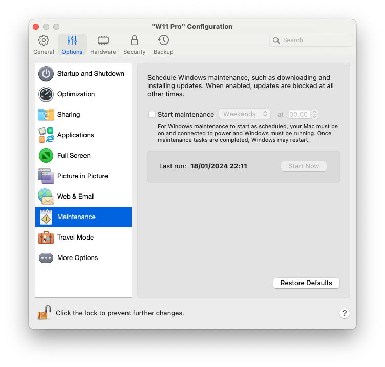 <table><thead><tr><th width="287">Option</th><th>Beschreibung</th></tr></thead><tbody><tr><td><strong>Wartung starten</strong></td><td><p>Wählen Sie diese Option und geben Sie an, wann Windows Wartungsaufgaben durchführen kann. Es wird empfohlen, dass Sie die Zeit angeben, zu der Ihr Mac aktiv ist und sie keine wichtigen Arbeiten damit durchführen müssen.<br></p><p><a data-footnote-ref href="#user-content-fn-1"><strong>Hinweis:</strong> Die virtuelle Maschine muss zu diesem angegebenen Zeitpunkt eingeschaltet sein.</a></p></td></tr></tbody></table>