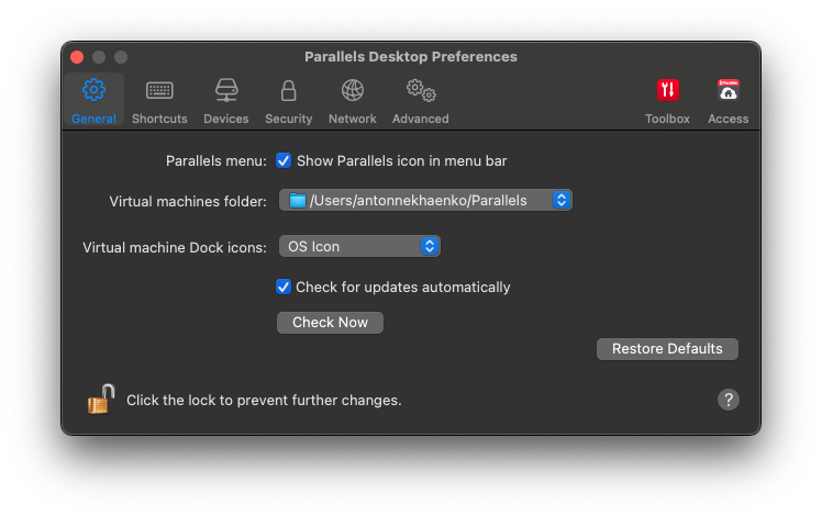 Verwenden Sie die Einstellungen **Allgemein**, um festzulegen, ob das Parallels-Menü in der Menüleiste von macOS verfügbar ist, den Ordner zu ändern, indem Ihre virtuelle Maschinen gespeichert sind, und mehr.