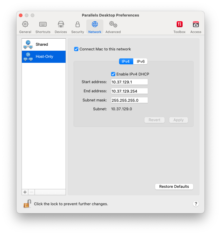To change the host-only network settings, click **Host-Only** and make the necessary changes to the settings of the Parallels DHCP servers for IPv4 and IPv6. These servers, enabled by default, automatically assign IP addresses to your virtual machines operating in the host-only networking mode. Please note that your Mac’s IPv4 address in this network is 10.37.129.2, not 10.37.129.1.