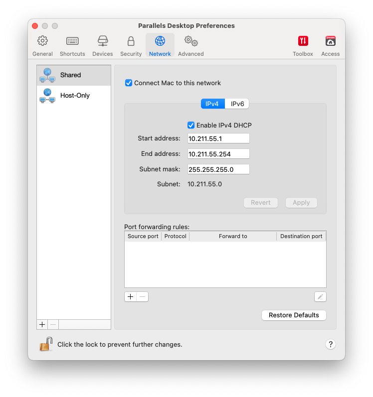 To change the shared network settings, click **Shared** and make the necessary changes to the settings of the Parallels DHCP servers for IPv4 and IPv6. These servers, enabled by default, automatically assign IP addresses to your virtual machines operating in the shared networking mode. Please note that your Mac’s IPv4 address in this network is 10.211.55.2, not 10.211.55.1.