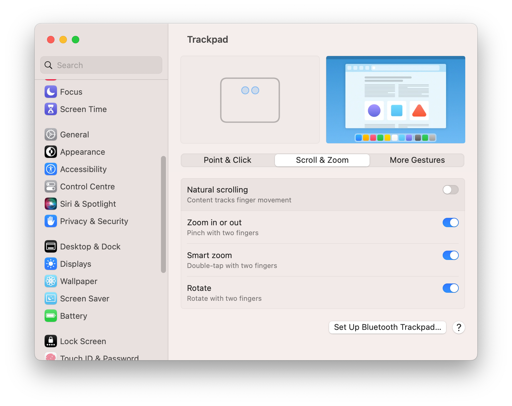 Parallels Desktop は、Apple Silicon Mac 上のゲスト macOS マシンでマルチタッチジェスチャーをサポートします（制限あり）。現在のところ、2 本指のジェスチャーがサポートされており、たとえば、縦横スクロール、回転、ピンチによるズームインとズームアウトが可能です。
