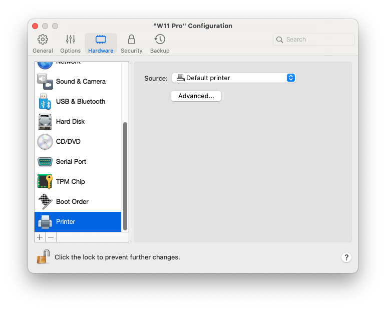 **\[プリンター]** ペインで、仮想マシンのプリンターポート設定を表示および構成できます。