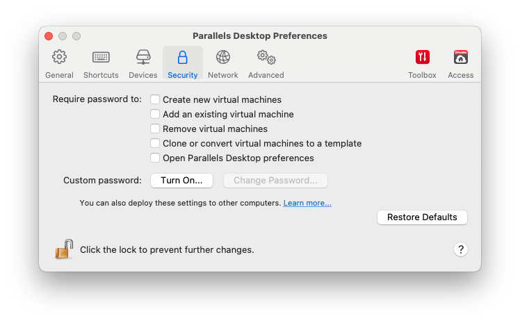 これらの環境設定を開くには、**\[Parallels Desktop]** > **\[環境設定]** を選択し、**\[セキュリティ]** をクリックします。