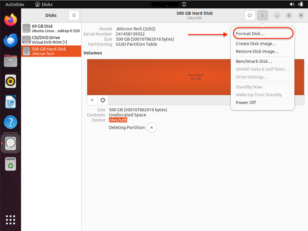 3. En haut à droite dans la fenêtre de l'utilitaire **Disques**, sélectionnez le menu représenté par trois points alignés à la verticale, puis choisissez l'option **Formater le disque**.\ <br>