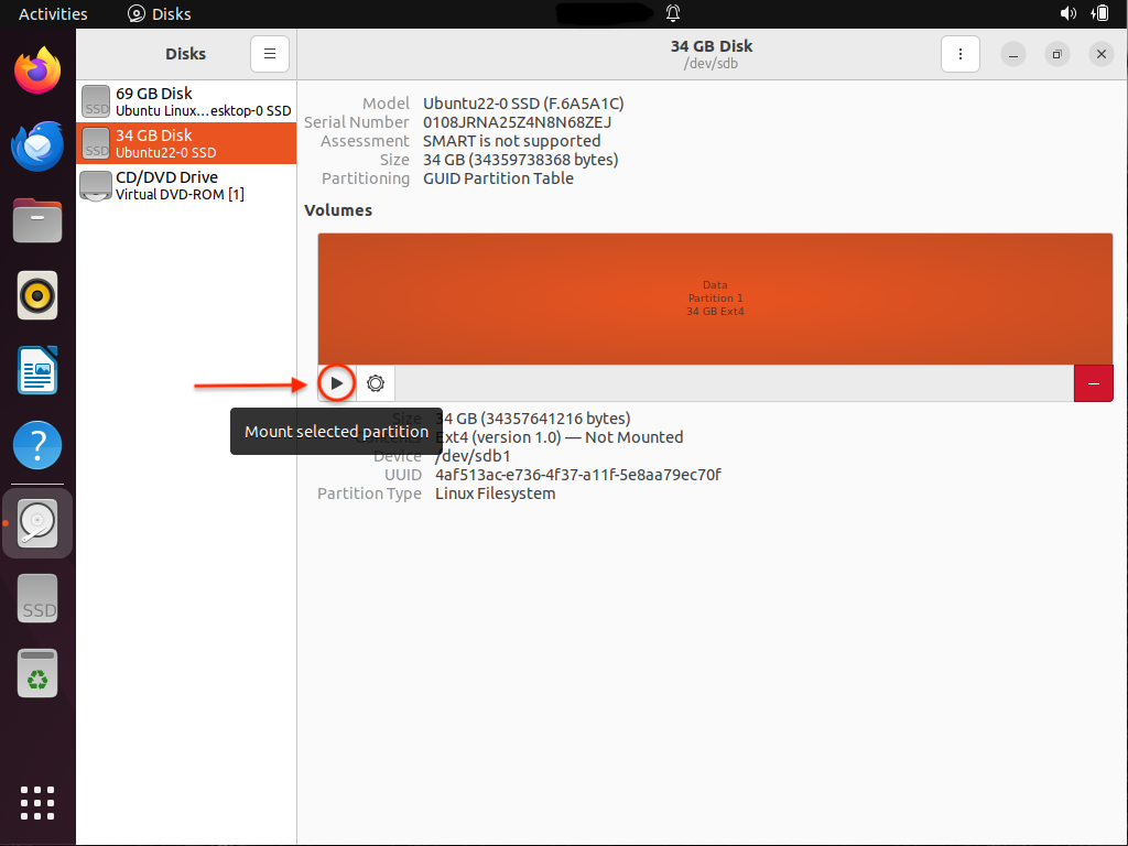 Une fois l'opération terminée, cliquez sur le bouton de lecture (représenté par un triangle) pour monter la nouvelle partition et y accéder depuis votre machine Linux.