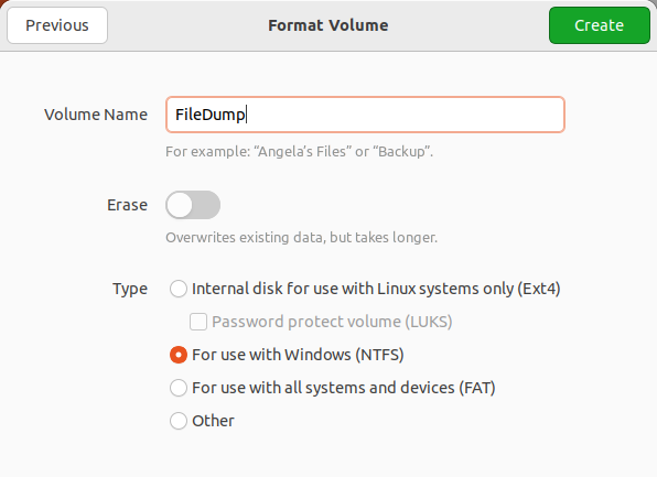 3. Dans la boîte de dialogue suivante, saisissez le nom du volume, choisissez l'un des systèmes de fichiers suggérés, puis cliquez sur **Créer**.\ <br>