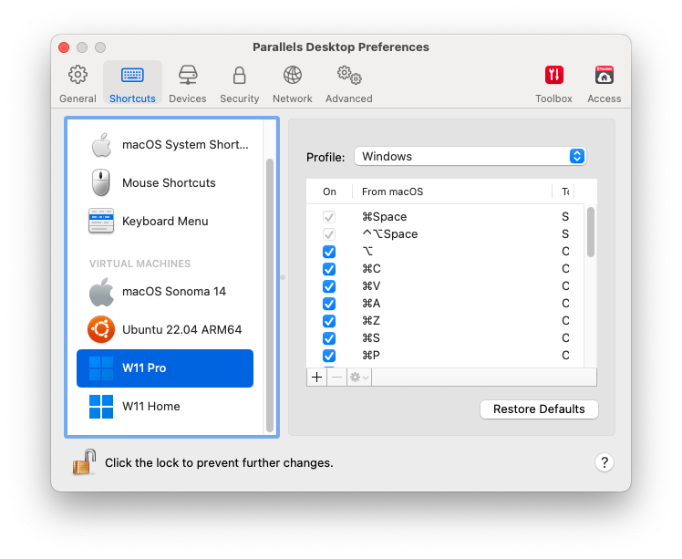 Dans le volet **Raccourcis** des Préférences de Parallels Desktop, vous pouvez également affecter les profils à vos machines virtuelles.