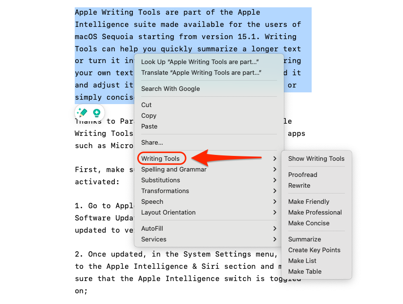 3. Pour que les Outils d'écriture fonctionnent, ouvrez un éditeur de texte sur votre Mac, écrivez ou collez du texte, sélectionnez-le ou cliquez dessus avec le bouton droit. Le menu Outils d'écriture doit apparaître.<br>