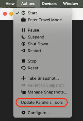 3. Dans la barre de menus macOS, sélectionnez le menu **Actions** et vérifiez s'il propose de mettre à jour les Outils Parallels. Si c'est le cas, sélectionnez cette option et suivez la procédure.<br>