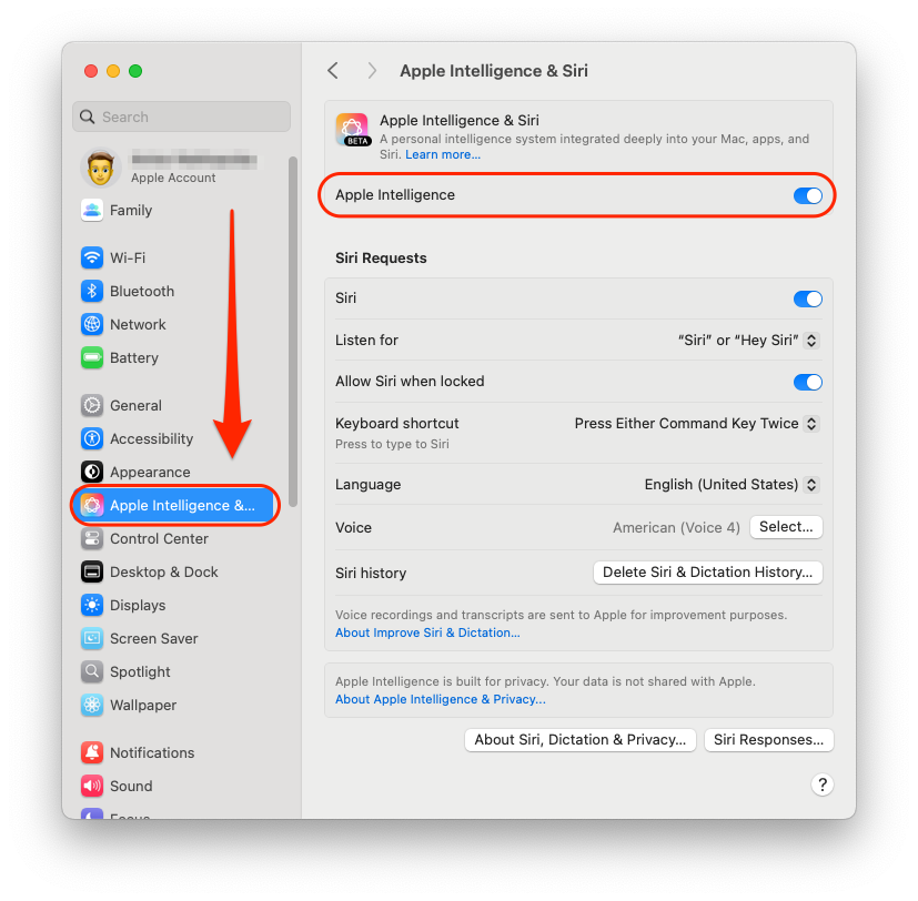 2. Après la mise à jour, accédez au menu **Réglages système**, faites défiler l'affichage jusqu'à la section **Apple Intelligence et Siri**, puis vérifiez que le commutateur **Apple Intelligence** est activé.<br>
