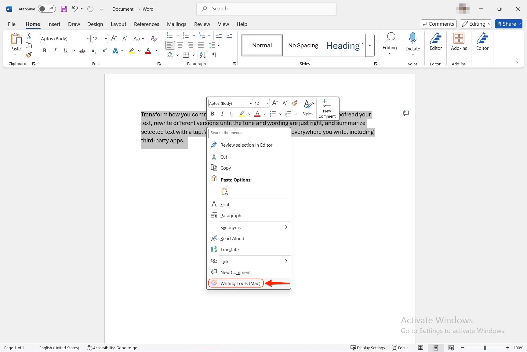 Lorsque vous aurez finalisé cette procédure, les Outils d'écriture Apple devraient être disponibles dans vos applications Windows. Pour les utiliser, sélectionnez un bloc de texte, cliquez dessus avec le bouton droit de la souris et sélectionnez l'option de menu **Outils d'écriture (Mac)**.