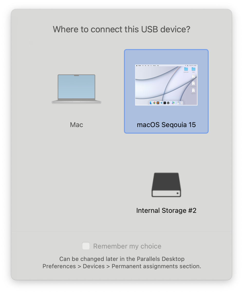 3. Collega il tuo dispositivo USB e attendi che appaia la finestra di dialogo di connessione di Parallels Desktop.<br>