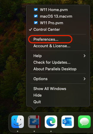 Per accedere alle Preferenze di Parallels Desktop, fai clic con il tasto destro sull'icona Parallels Desktop nel Dock e scegli **Preferenze**.