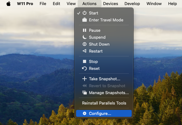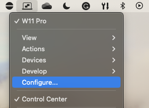 * Se la macchina virtuale è in esecuzione in modalità di visualizzazione Coherence, fai clic sull'icona Parallels Desktop in alto a destra della barra dei menu di macOS e scegli **Configura**.<br>