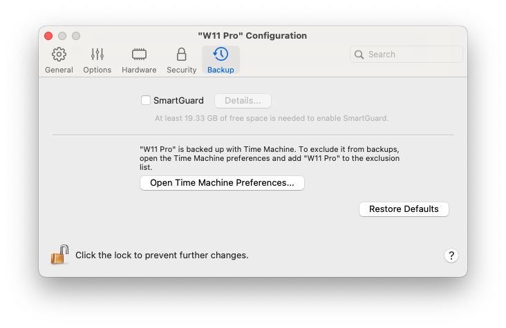 <table><thead><tr><th width="209">Opzione</th><th>Descrizione</th></tr></thead><tbody><tr><td><strong>SmartGuard</strong></td><td>Se desideri creare automaticamente le istantanee della macchina virtuale, seleziona <strong>SmartGuard</strong> > <strong>Dettagli</strong> e <a href="../../argomenti-avanzati/lavorare-con-macchine-virtuali/salvataggio-delle-istantanee-di-una-macchina-virtuale">specifica i dettagli</a>, ovvero la frequenza delle istantanee, quante archiviarne e se desideri ricevere una notifica prima della creazione di nuove istantanee.</td></tr><tr><td><strong>Preferenze di Time Machine</strong></td><td><p>Per impostazione predefinita, Time Machine esegue il backup automatico della macchina virtuale insieme ai file macOS.<br></p><p>Per escludere la macchina virtuale dai backup di Time Machine, apri le preferenze di Time Machine e aggiungi la tua macchina virtuale all'elenco di esclusioni.<br></p><p>Se in un secondo momento hai necessità di eseguire nuovamente il backup della tua macchina virtuale, apri le preferenze di Time Machine e rimuovi la macchina virtuale dall'elenco di esclusioni.</p></td></tr></tbody></table>