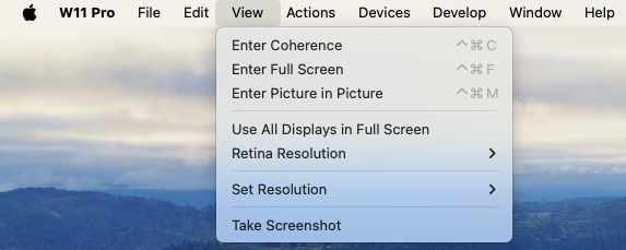 1. Definisci una nota per il nome del comando per cui desideri creare un'abbreviazione, nel modo in cui compare in un menu su Parallels Desktop. Ad esempio, se desideri creare una nuova abbreviazione per passare alla modalità Schermo Intero, aprendo il menu **Visualizza** in Parallels Desktop vedrai che il nome della voce del menu è **Entra in Schermo Intero**:<br>