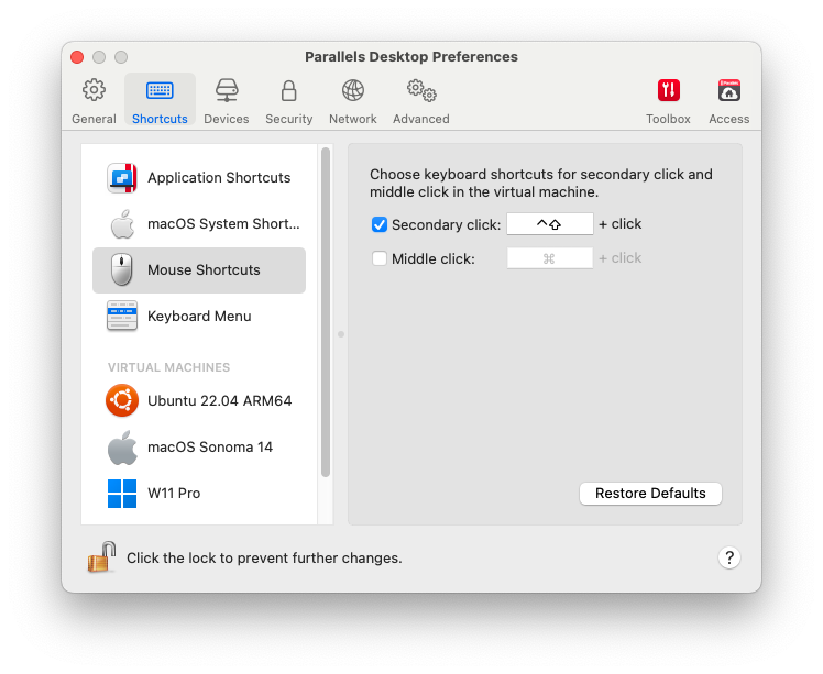 Per impostazione predefinita, Parallels Desktop è impostato per simulare un clic con il pulsante destro del mouse premendo su Shift+Control e facendo clic sul mouse. È possibile cambiare la combinazione di tasti per attivare il clic con il pulsante destro del mouse.