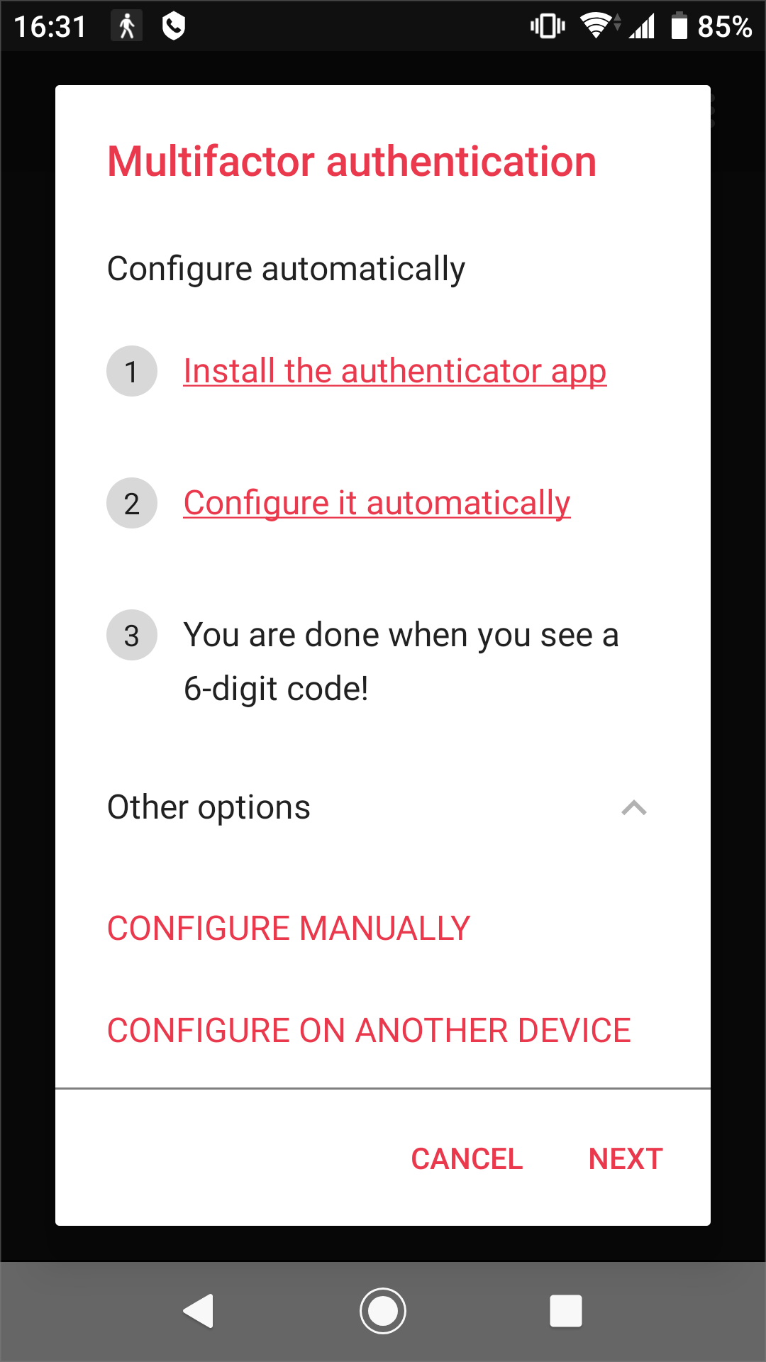 * **Configure on another device**. You can install, configure and use Google Authenticator on any of your other mobile devices. Tap **Other options** at the bottom of the screen, select **CONFIGURE ON ANOTHER DEVICE** and follow the onscreen instructions.