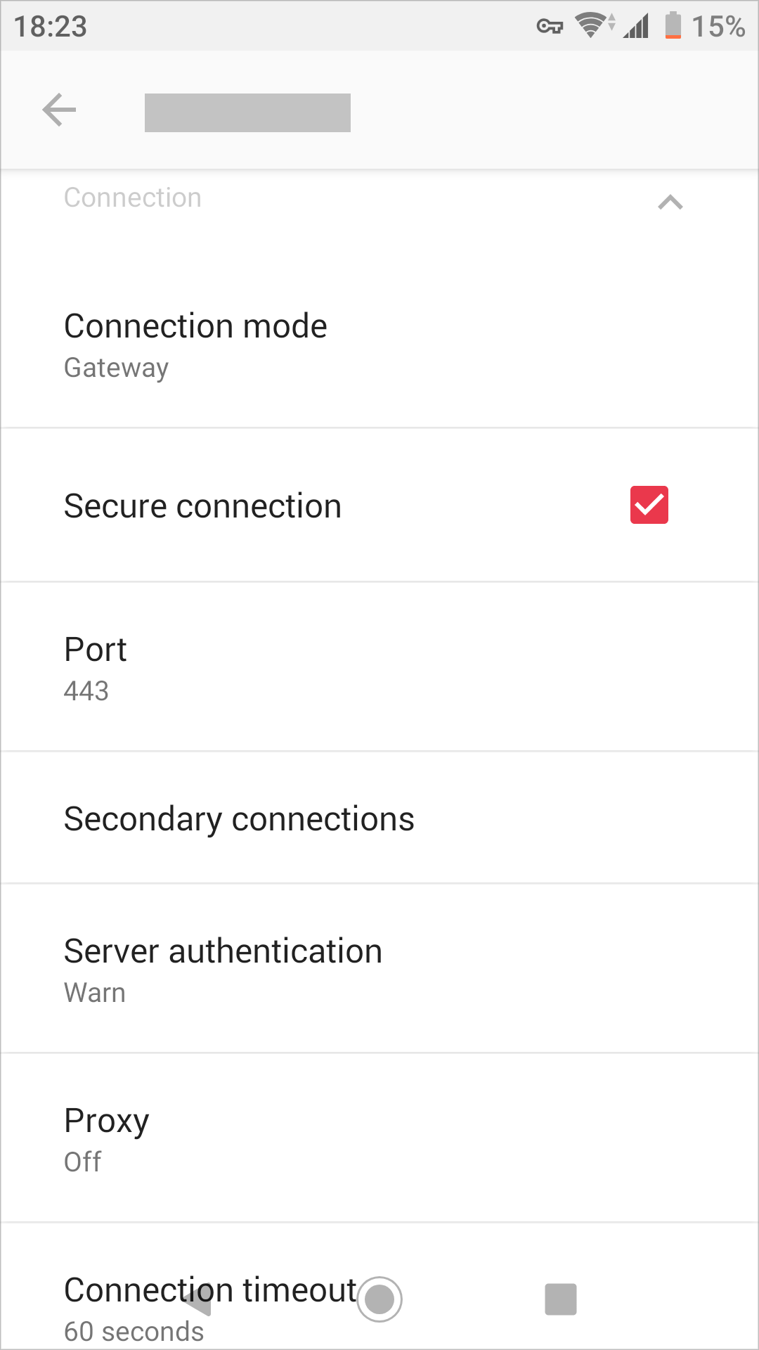 * **Server authentication**. Tap this field to choose what to do when an untrusted certificate is used to establish connection to the remote server.