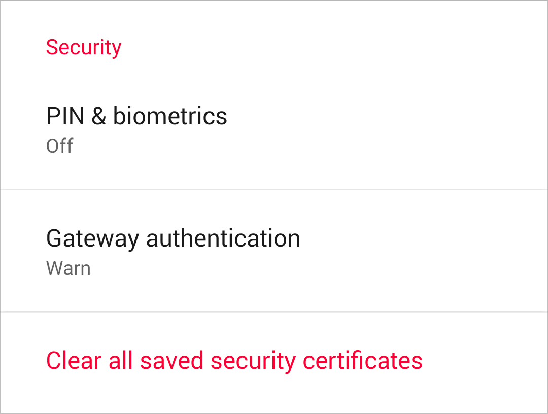 * **Gateway authentication**. Tap this field to choose what to do when the gateway certificate is untrusted.