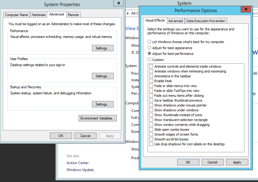 Under the Visual Effects tab from the Performance Options dialog box, change the setting to **Adjust for best performance**.