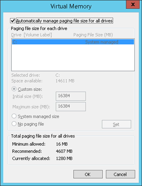 Set the Windows paging file to twice the amount of RAM. For heavier workloads, a paging file of three times the amount of physical memory might be required. For more information on how to determine the exact page file size, please visit <https://support.microsoft.com/en-us/help/2860880/how-to-determine-the-appropriate-page-file-size-for-64-bit-versions-of-windows>.