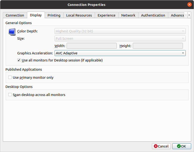 * **Desktop Options - Span desktops across all monitors**. If selected, remote desktops will be spanned across all connected monitors.