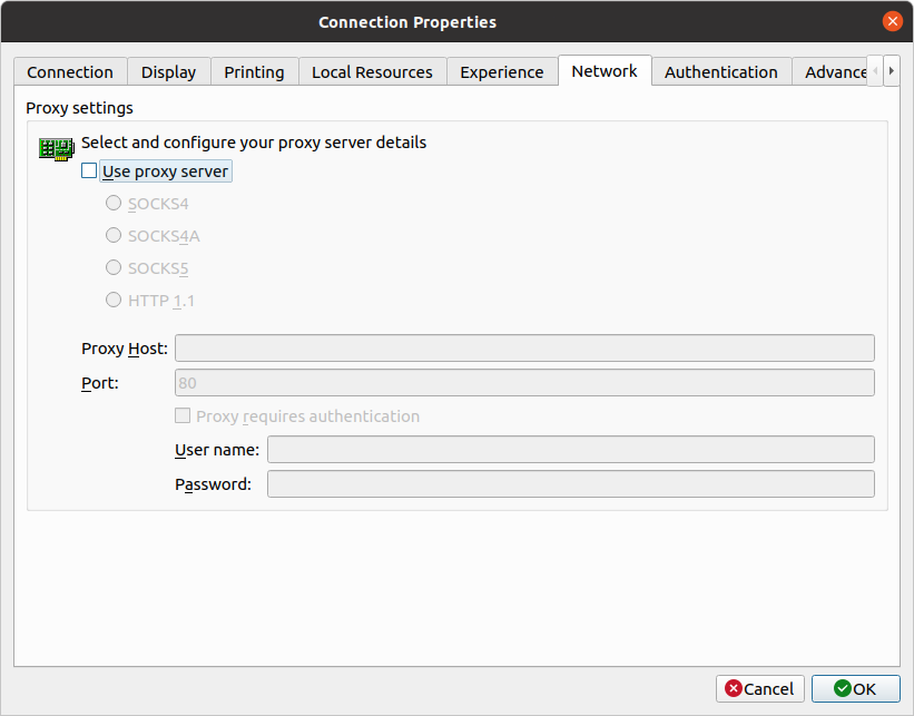 Use the **Network** tab page to configure a proxy server if you use one to connect to the remote computer.