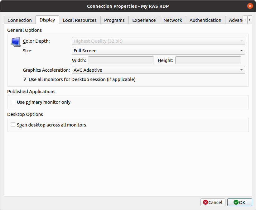Use all monitors for Desktop session (if applicable). If you have more than one monitor connected to a remote computer, the RDP session will display both of them. The screen size must be set to Full Screen. The Span desktop across all monitors option must be disabled.