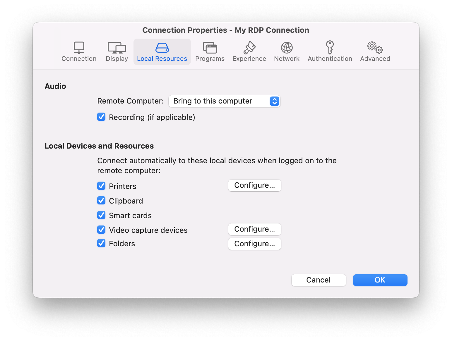 Use the **Local Resources** tab page to configure how local resources are handled by the remote computer.