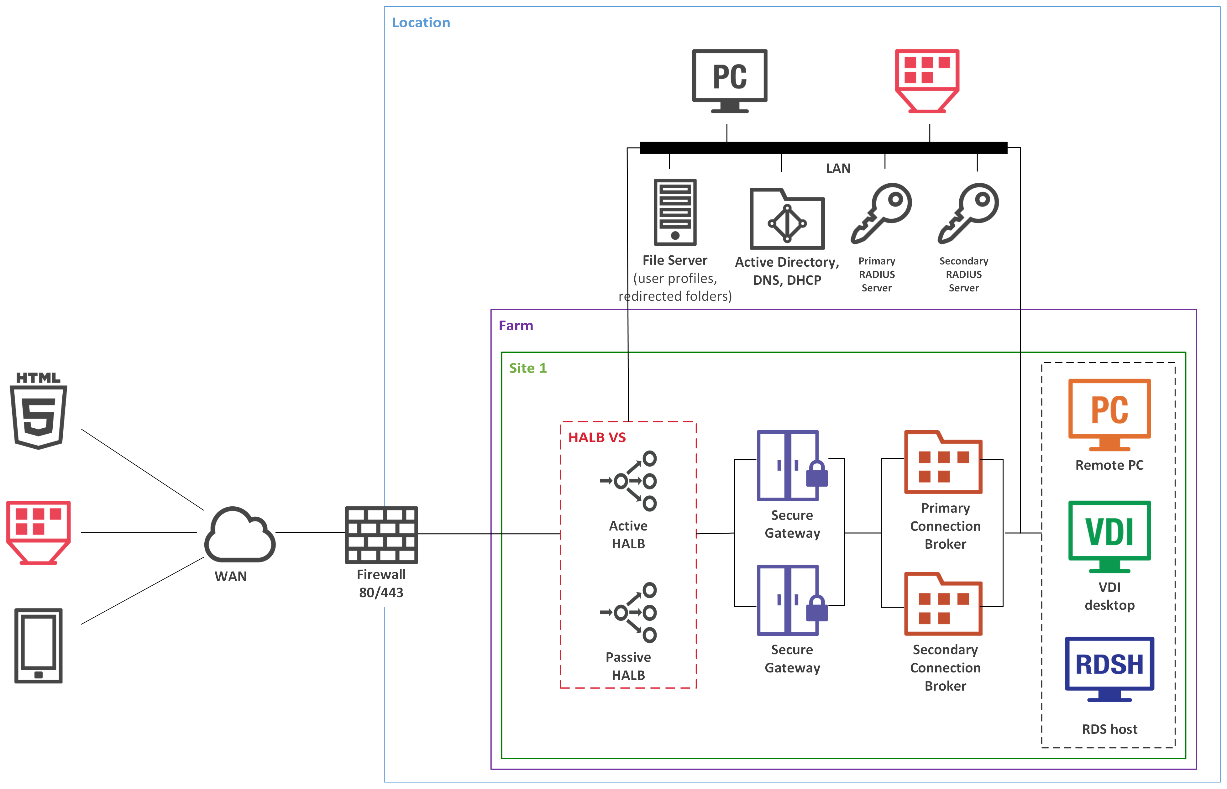 Both LAN and WAN users connect to IP address of the HALB VS which represents the HALB virtual appliances in the internal network.