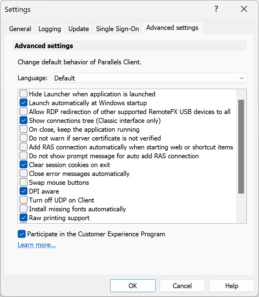* **Add RAS Connection automatically when starting web or shortcuts items**. This option will add the connection preferences in the Parallels Client when starting an item contained in a connection that is not yet listed.