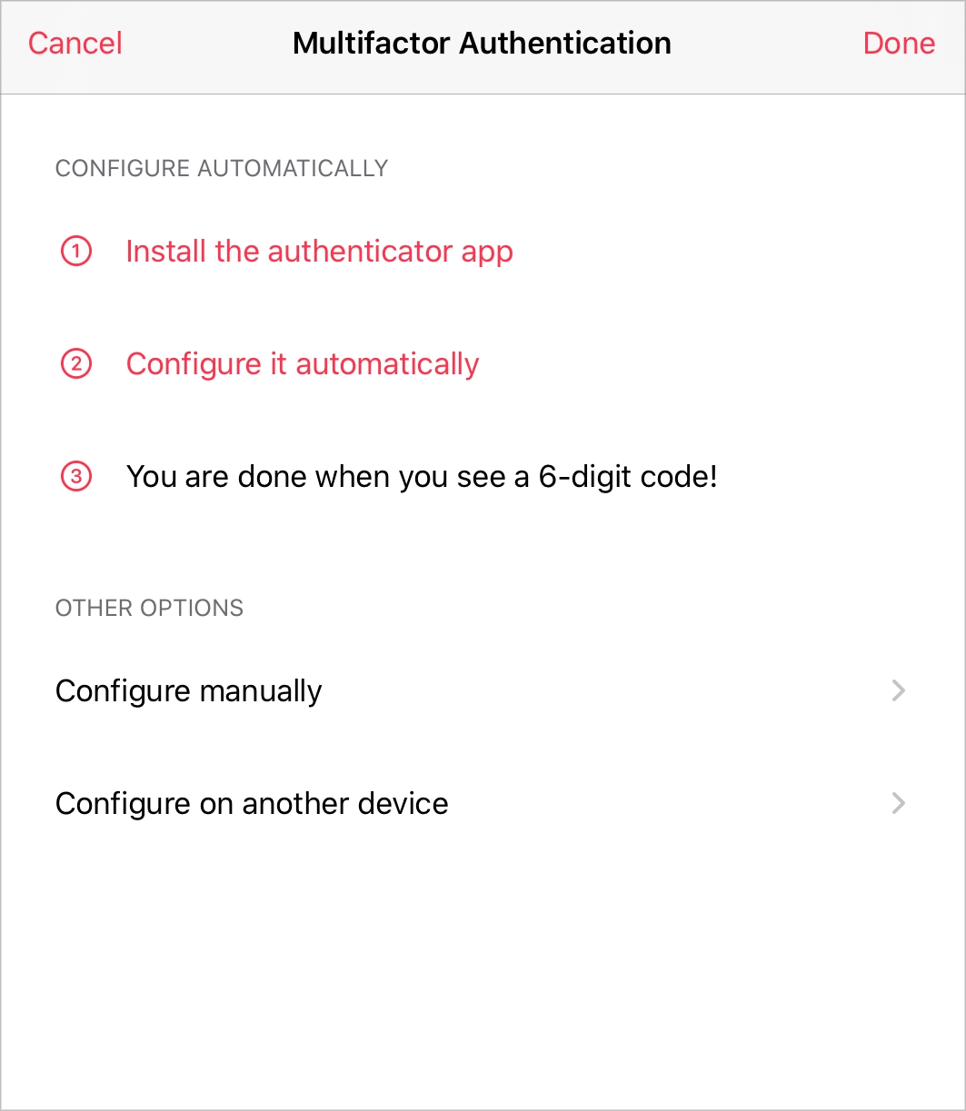 Configure manually. To configure Google Authenticator manually, tap Configure manually in the OTHER OPTIONS section and follow the onscreen instructions.
