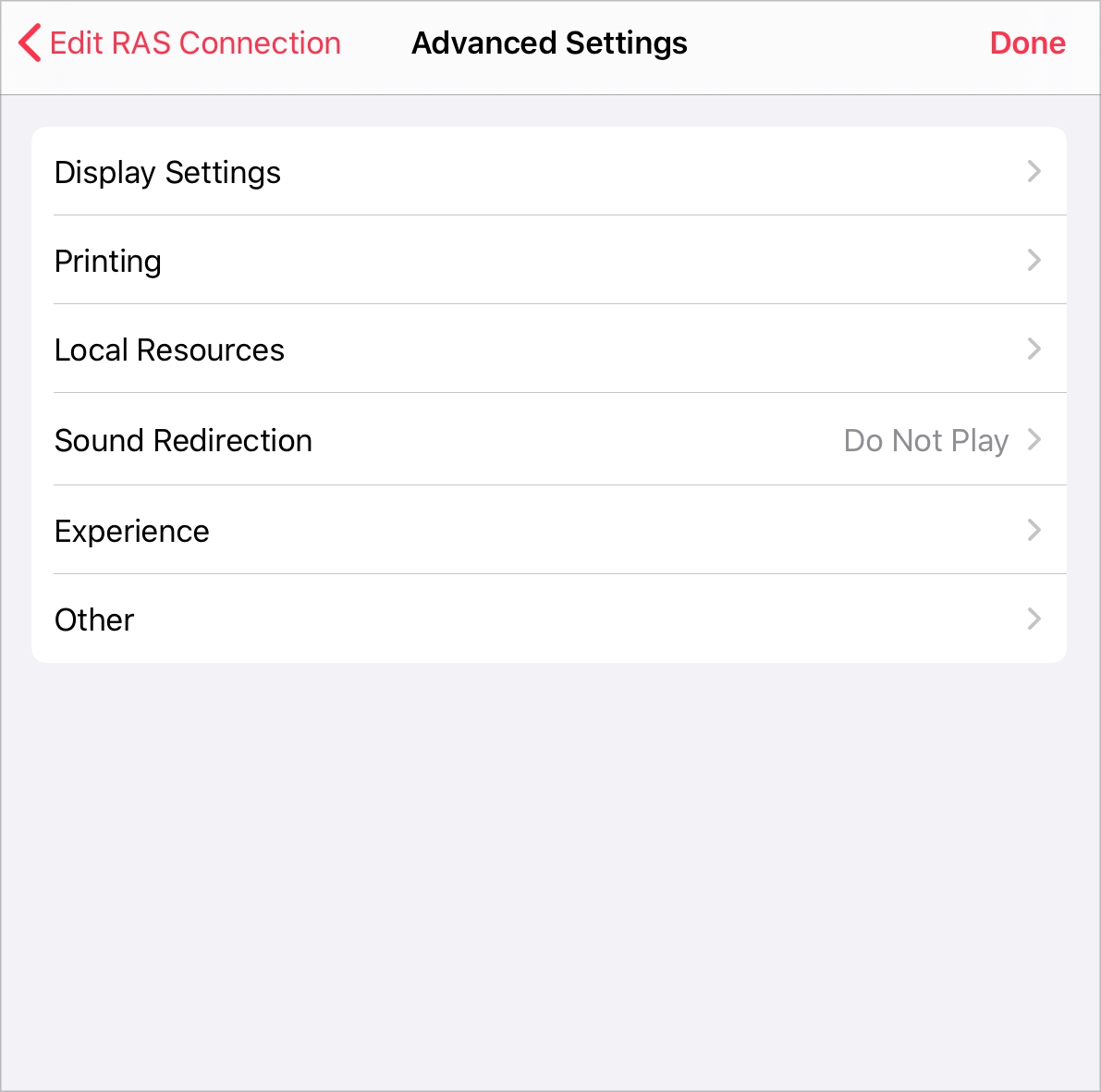Local Resources. Tap this option to open the local and drive redirection settings.