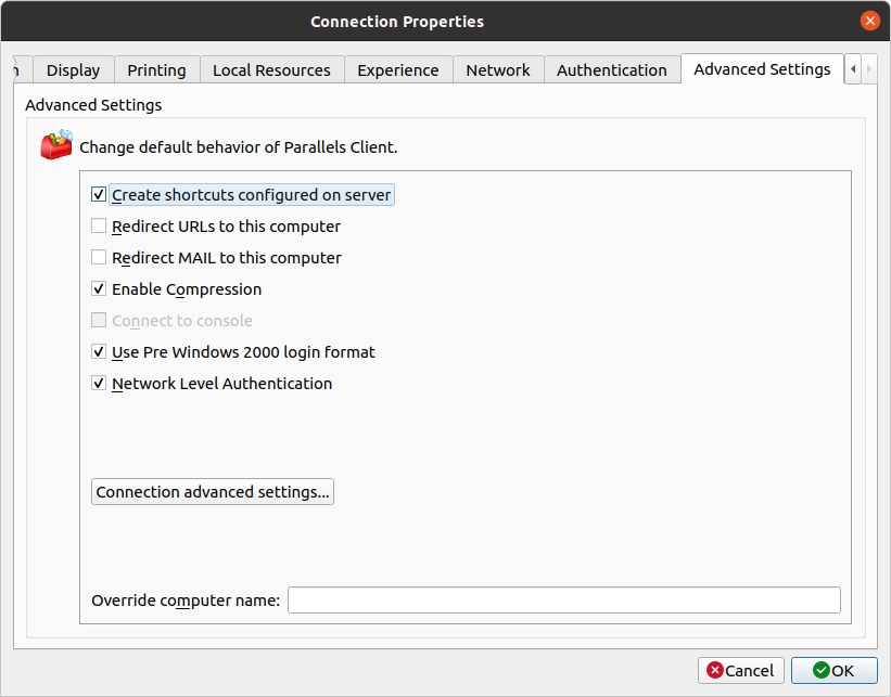 The Advanced Settings tab page allows you to customize the default behavior or Parallels Client.
