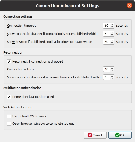 Connection timeout: The amount of time during which the client will try to connect to Parallels RAS until the connection is aborted. While the connection is being established, the connection banner will be shown.