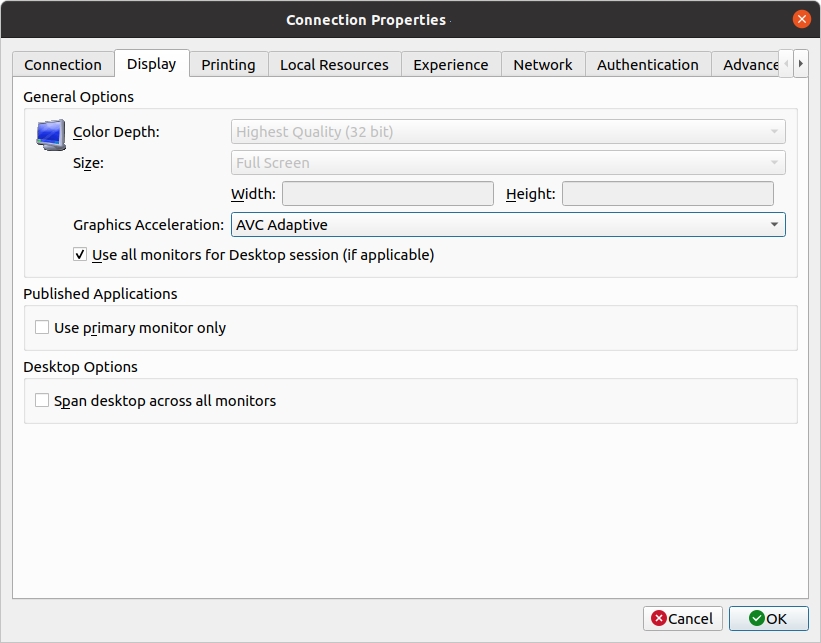 Desktop Options - Span desktops across all monitors. If selected, remote desktops will be spanned across all connected monitors.